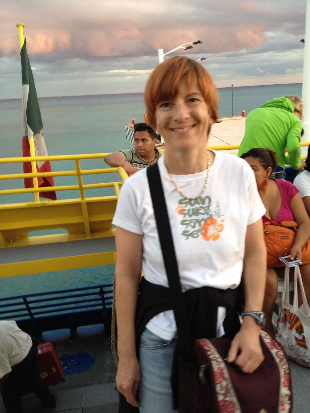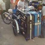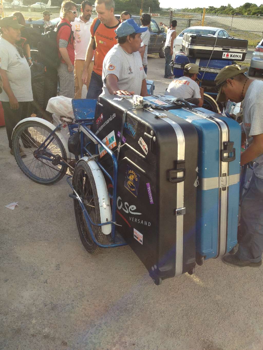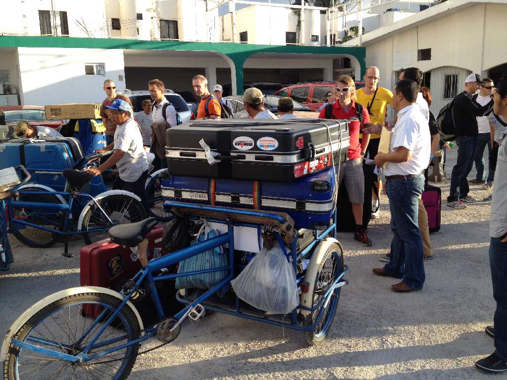 Heute morgen um 05:15 war die Nacht zu Ende. Ziemlich pünktlich um 8:30 sind wir gestartet. Um 13:30 Ortszeit sind wir nach 12 Stunden in Cancun gelandet. Dann hat es sich ganz schön hingezogen, bis wir durch die Einwanderungsbehörde und den Zoll waren. Jetzt ging es zum Bus – hat sich auch noch mal hingezogen bis da alles verstaut war und der extra Transporter für die Räder, die nicht mehr in den Bus gepasst haben, da war. Dann wurden wir endlich nach Playa del Carmen gekarrt. Vom Parkplatz zur Fähre waren ein paar hundert Meter zurückzulegen. Das Gepäck wurde von mexikanischen Gepäckfahrrädern gefahren und kam allen Triathletenängsten zum trotz auch an 😉