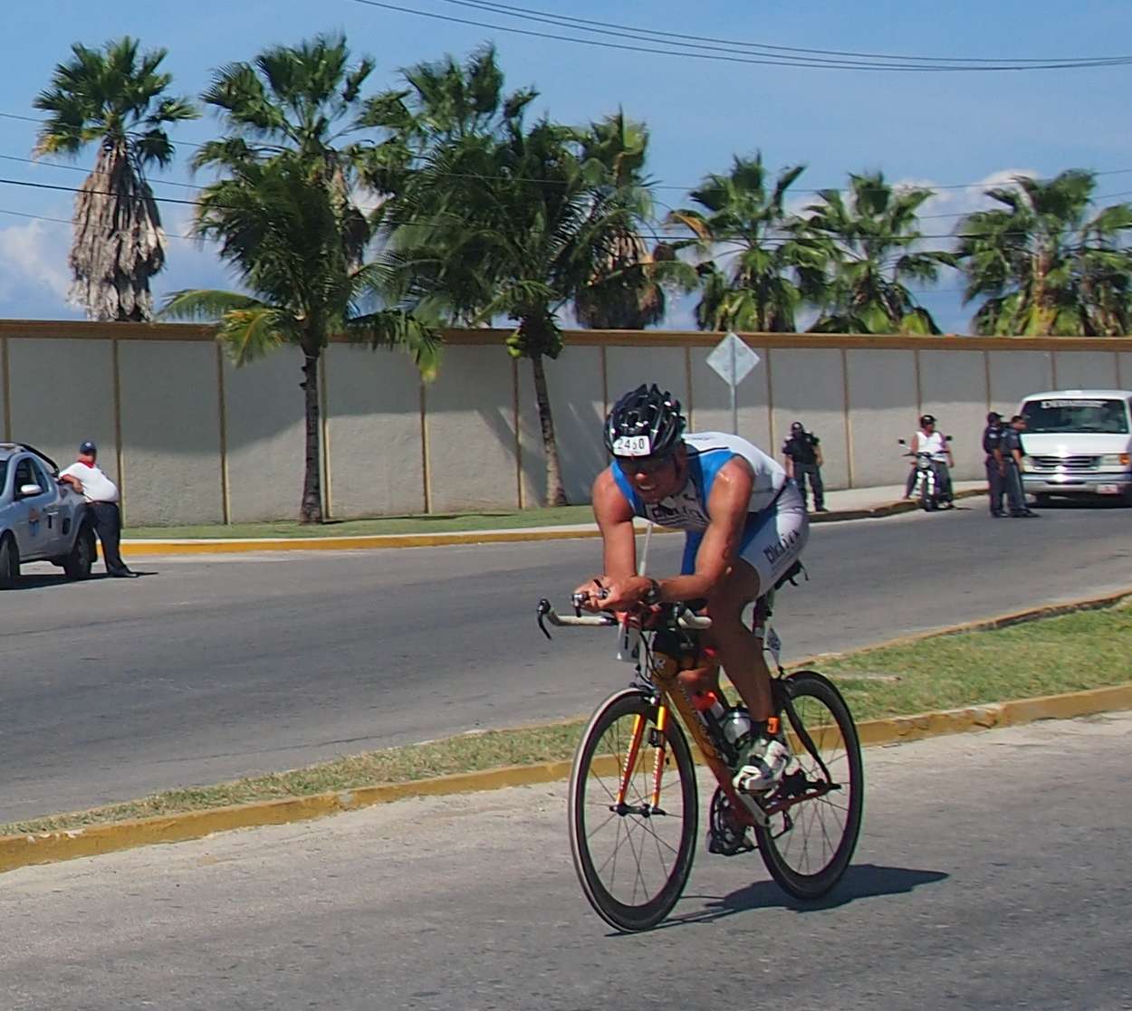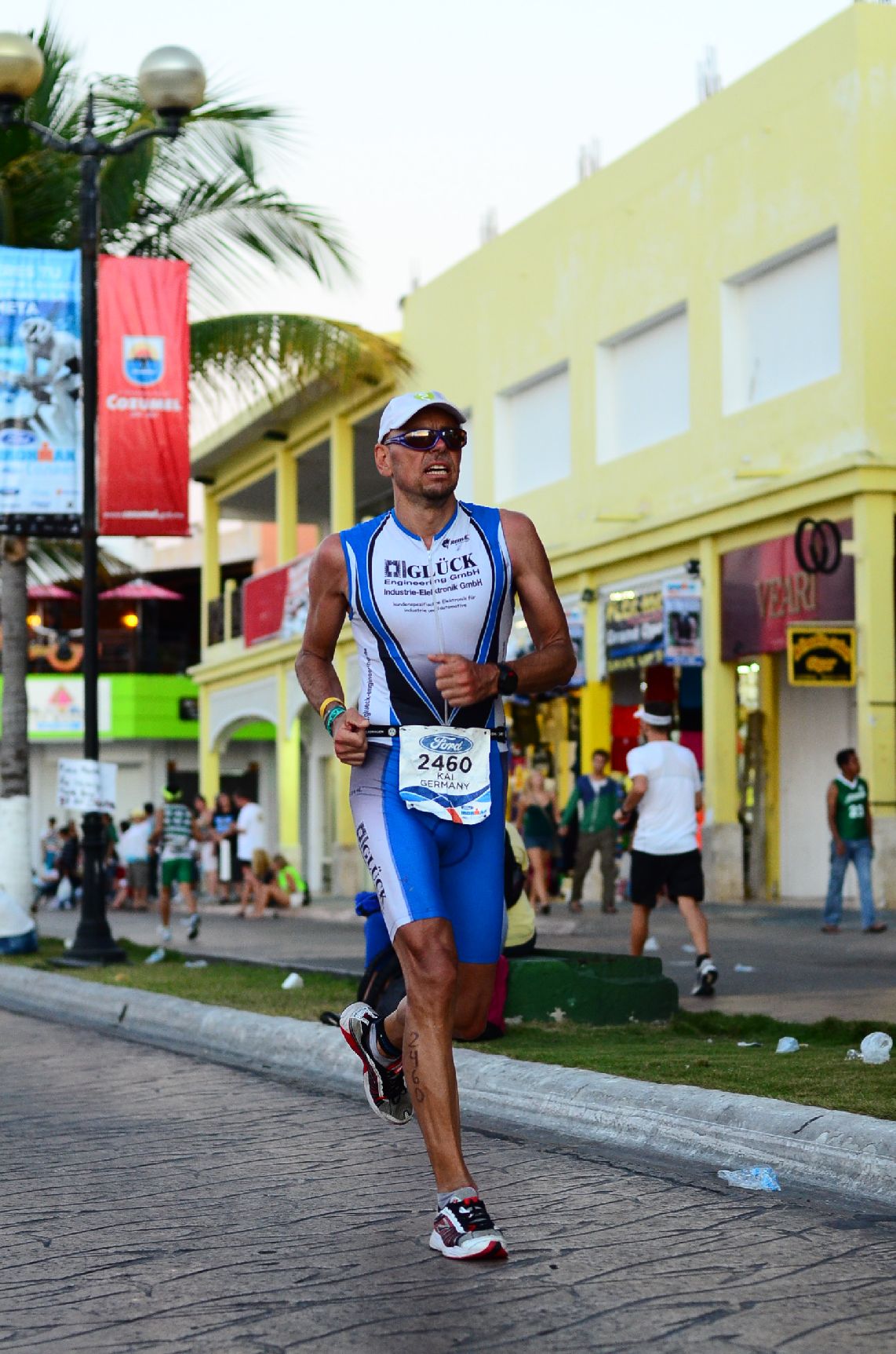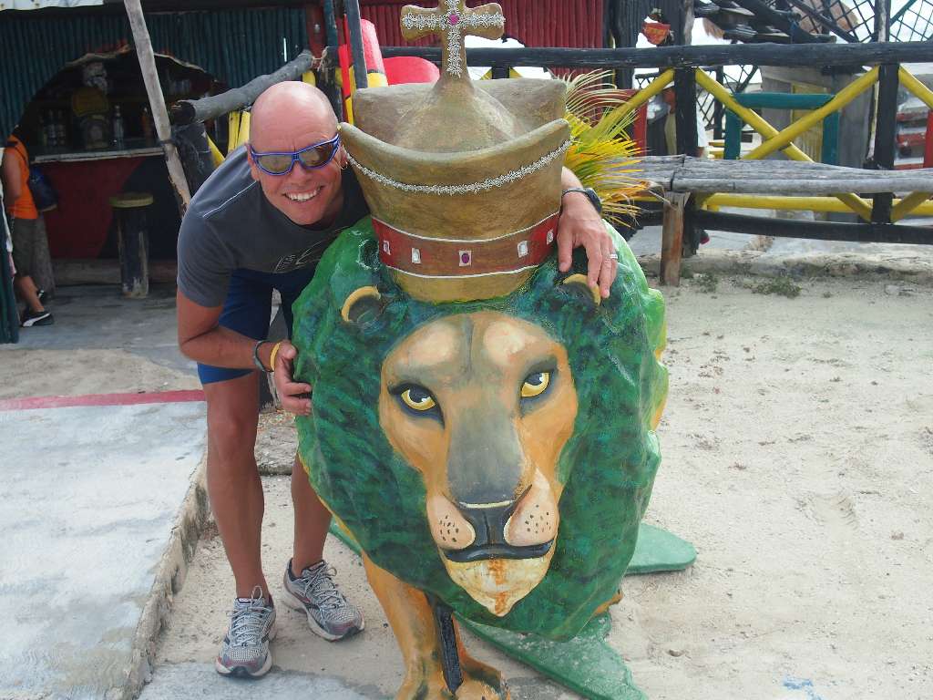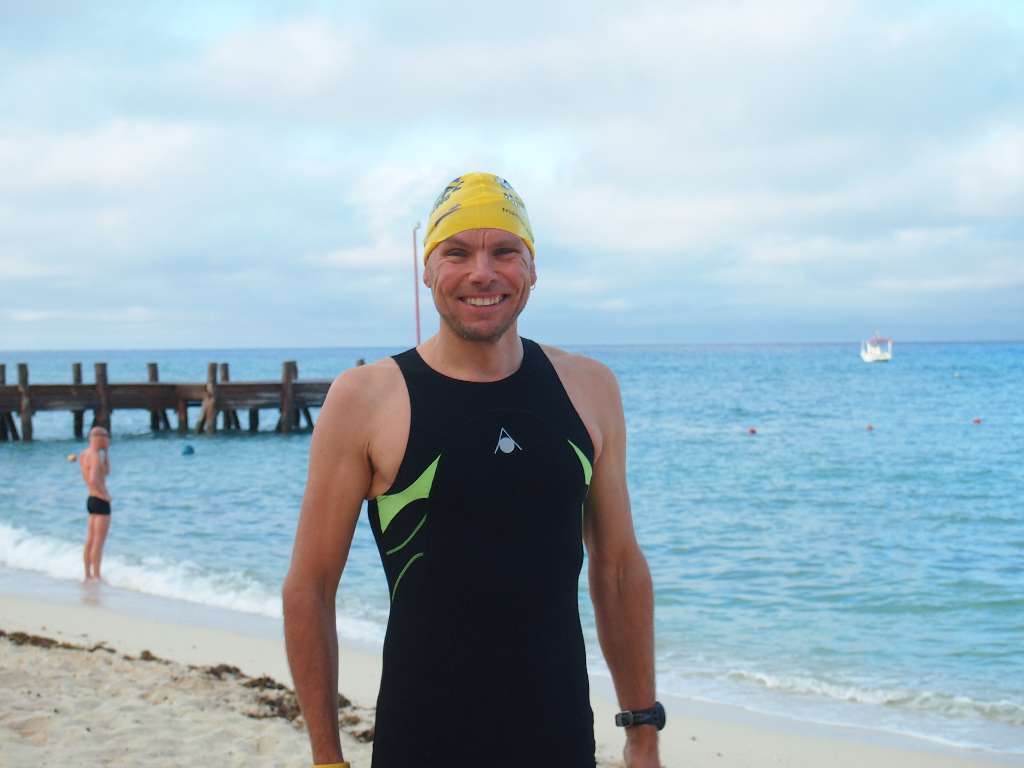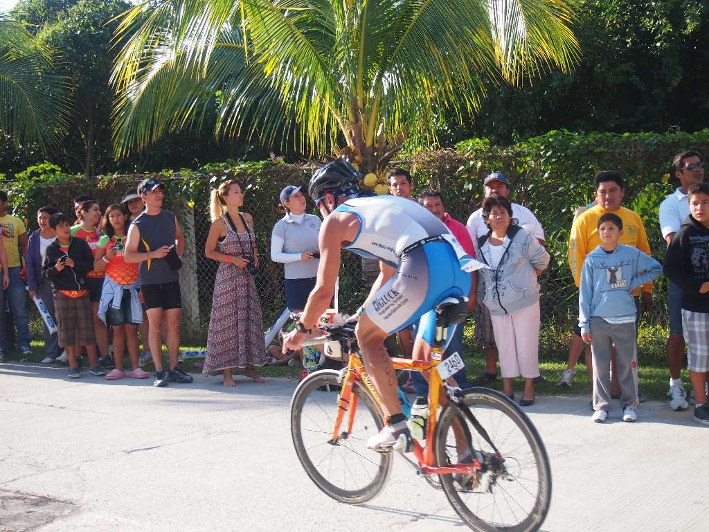 Der Bike-course führt 3x um die Insel entlang sensationeller Karibikstrände mit türkisem Wasser. Der Wettkampftag sollte sich als der heißeste unseres Urlaubs erweisen was ganz nach meinem Geschmack war. Der Wind blies aus nördlicher Richtung. D.h. von Chankanaab waren die ersten 20km Rückenwind und dann die nächsten 20km Gegenwind. Die von mir befürchtete Pulkbildung und Drafting-Problematik konnte ich nicht beobachten. Einzelne kleinere Gruppen mit weniger als 5 Mann gab es dagegen schon, zumindest in der ersten Runde. In den Penaltyboxen saßen auch immer ein paar Sünder. Die erste Runde hab ich es krachen lassen, leider etwas zu schnell. Aber ich wollte möglichst nicht in einen größeren Pulk geraten. Die Gegenwindpassage hat aber Körner gekostet. In der 2. Runde hab ich dann etwas rausgenommen. Totzdem hab ich in der 3. Runde dafür bezahlt. Erst nach 5:20 – mindestens 10 Minuten langsamer als erwartet – hab ich dann mein Quintana Roo in der T2 in San Miguel abgestellt. Nach 6:38 bin ich dann los gelaufen und hab nach der 2. Enttäuschung des Tages meine Ziele gleich mit beerdigt.