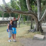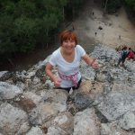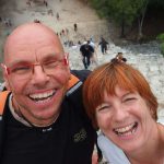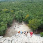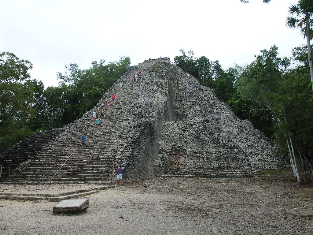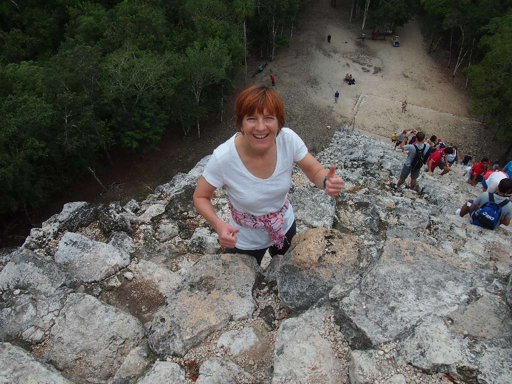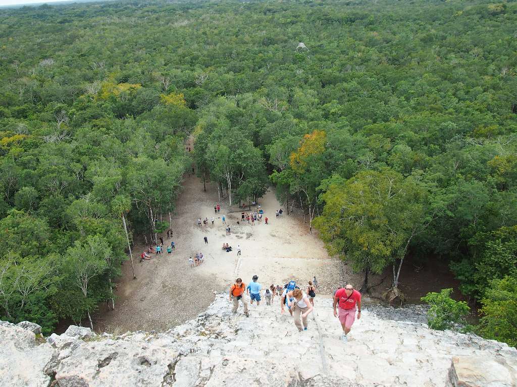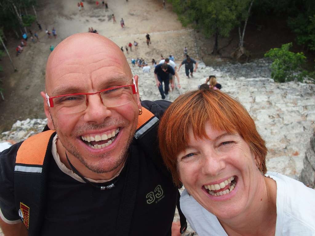 Unser erster Stop war in Cobá. Diese alte Maya-Stadt wurde aus ungeklärten Gründen von den Bewohnern verlassen und nie von den spanischen Eroberern entdeckt und mitten im Dschungel. Hier befindet sich eine der höchsten Maya-Pyramiden und die höchste auf Yucatán, die man besteigen darf: 140 steile Stufen bis auf 47 Meter Höhe – da kommen selbst durchtrainierte Triathleten ins schnaufen. Von oben ein atemberaubender Ausblick, aber schwindelfrei muss man da schon sein…
