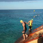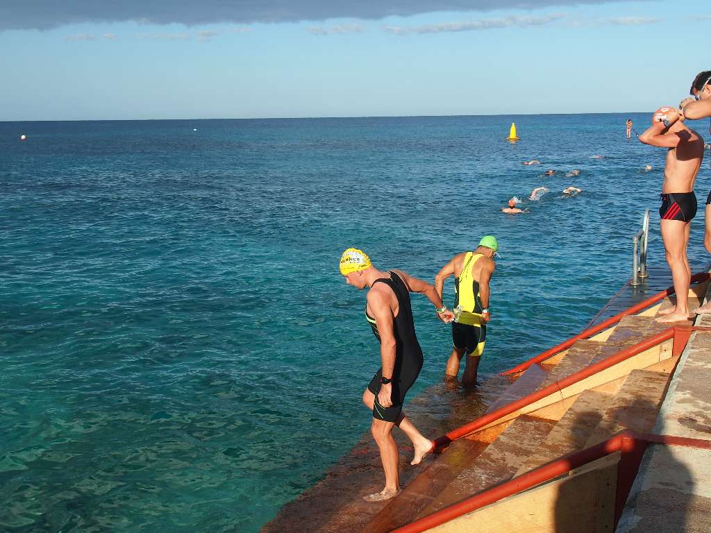 Die Schwimmstrecke läuft parallel zum Strand: nur eine Runde mit 2 Wendepunkten. Der Start erfolgt auf der nördlichen Seite des Piers. Zuerst vielleicht 600m Richtung Norden gegen die Strömung, dann nach 50m quer (raus aufs Meer), 1900m nach Süden und dann wieder 1300m gegen die Strömung.
