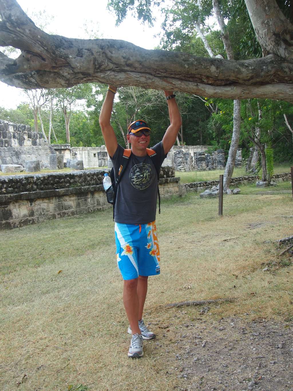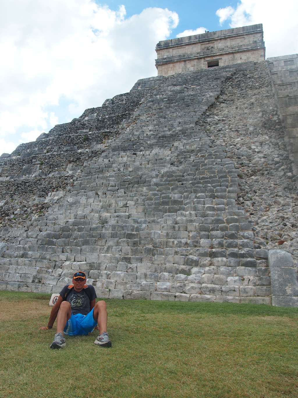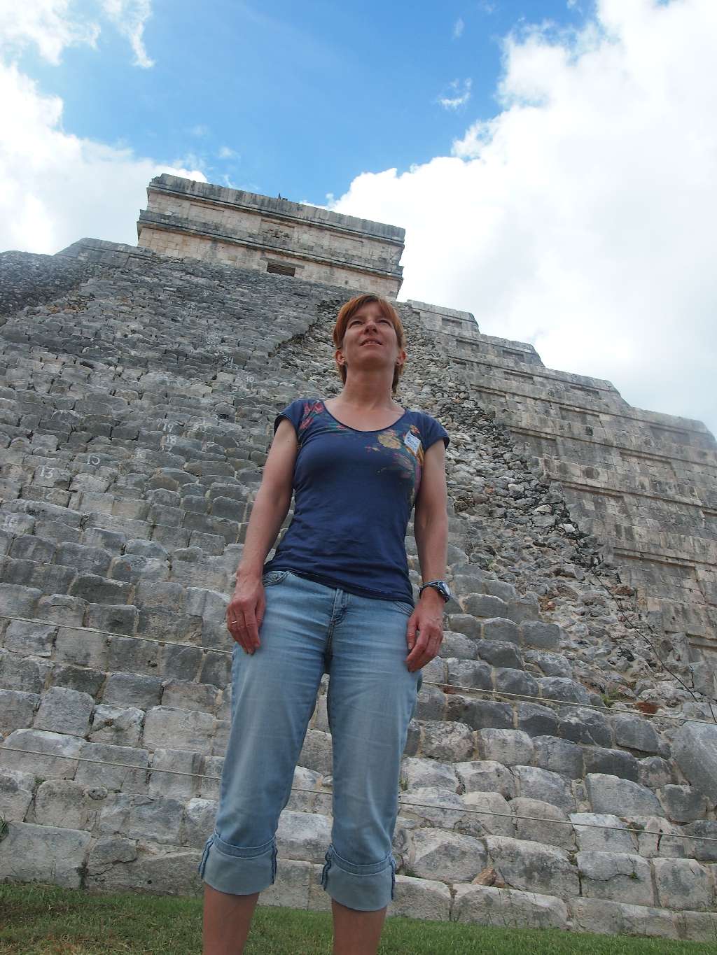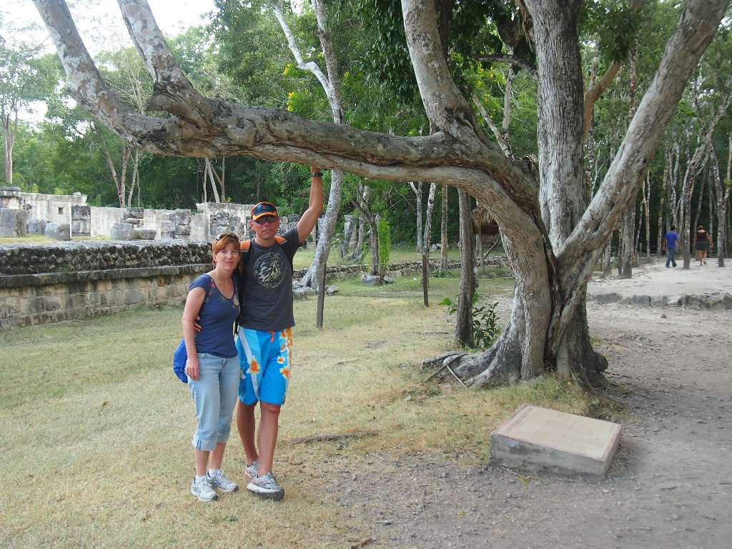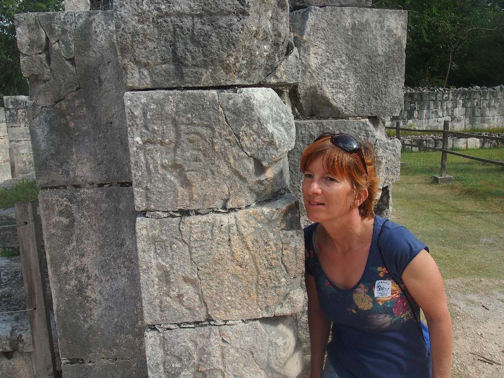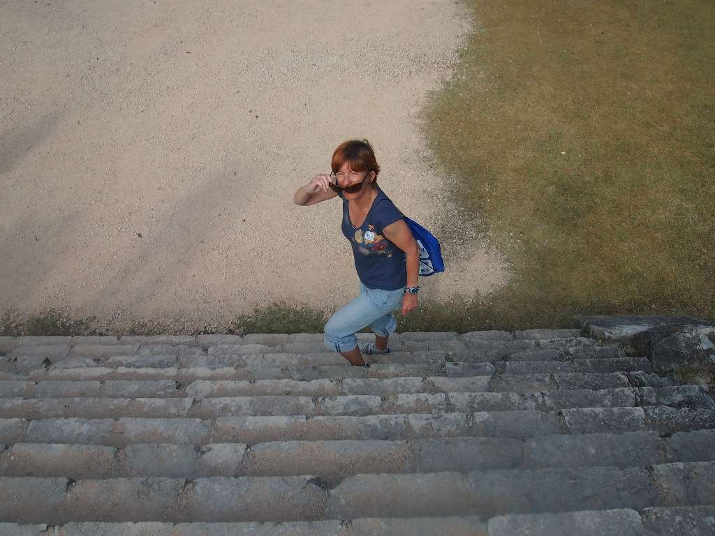 Wie schon berichtet, haben wir am Tag vor dem Wettkampf einen Ausflug nach Chitzen Itza gebucht und wollten morgens um 6 Uhr mit dem besagten Moped zum Hafen fahren. Der Tag ging gut los und der unzuverlässige Kerl sprang partout nicht an. Also Taxi statt Moped und die Laune war auch schon suboptimal. Doch von jetzt an hat der Rest funktioniert. Am Hafen hat der erste auf uns gewartet, unser Oberteil mit einem hübschen Aufkleber verpasst und und Instruktionen für Playa del Carmen gegeben. Mit der 7 Uhr-Fähre sind wir übergesetzt, drüben hat der nächste auf uns gewartet und uns zum Van gebracht. Zusammen mit 6 Amerikanern, einem Fahrer und unserem Guide ging es dann los. 230km bis nach Chitzen Itza … Die alte Maya-Stadt, die wie Coba aus unbekannten Gründen von ihren Bewohnern verlassen wurde, ist wirklich beeindruckend. Leider darf man aus Sicherheitsgründen auf keine der Pyramiden hochsteigen. Aber auch so ist die Anlage sehr interessant und unser Guide hat die Führung gut gemacht.